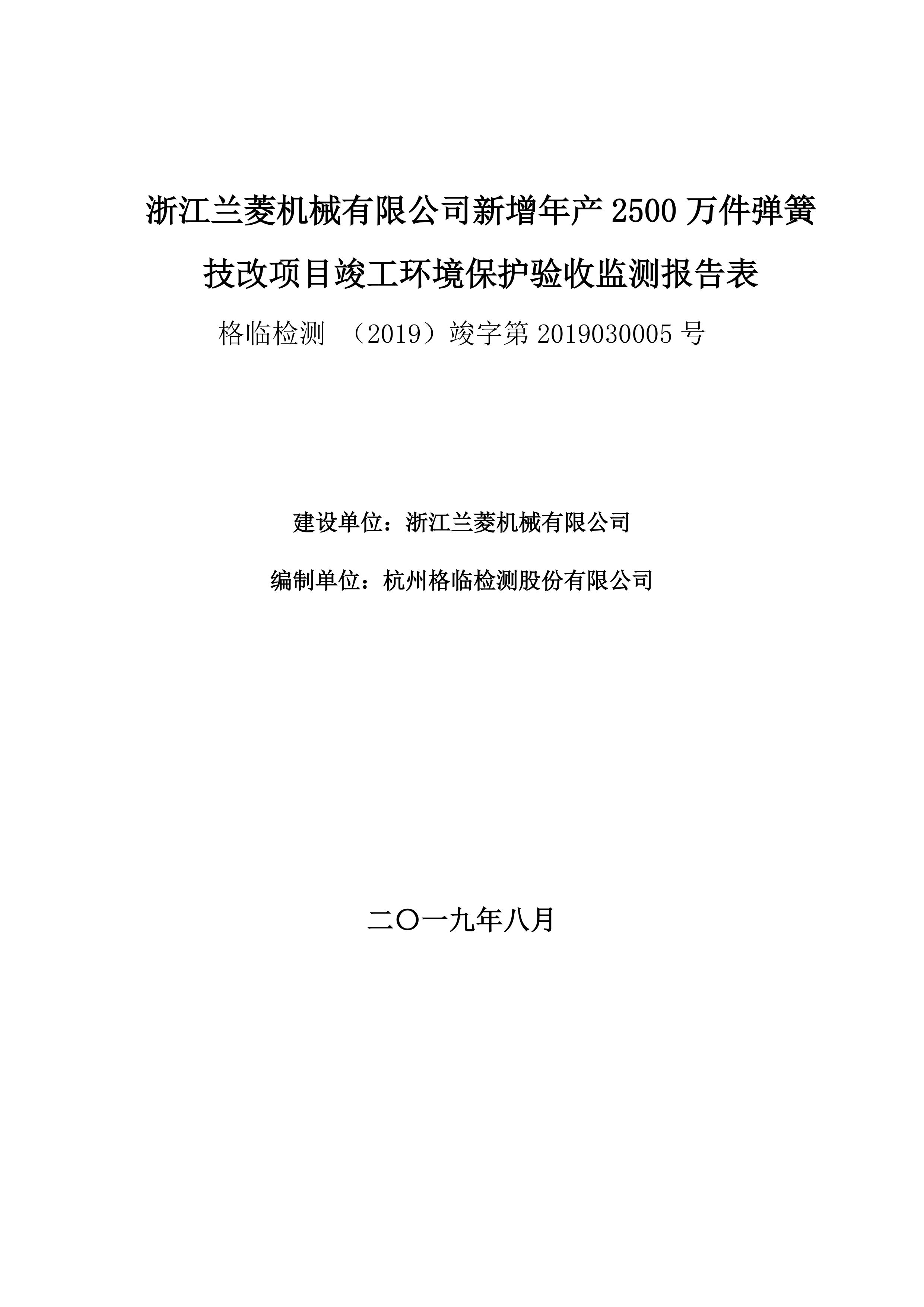 • 委托書號181301竣字2019030005號浙江蘭菱機械有限公司新增年產2500萬件彈簧技改項目“三同時”竣工環境保護驗收監測報告表